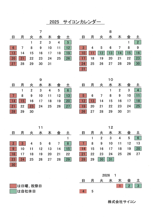 2025年7月~12月までのサイコン営業カレンダーのご案内です。 今後もより一層の品質向上に努めて参りますので変わらぬご愛顧を賜りますようお願い申し上げます。